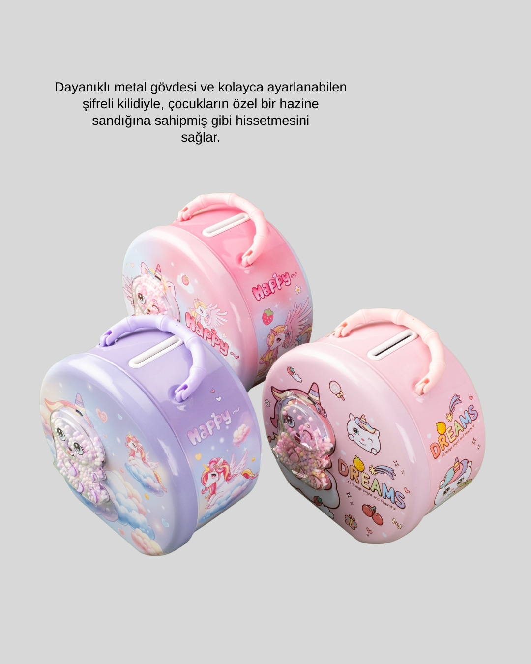 Bu şifreli metal çocuk kasası, çocukların hem güvenli saklama hem de bireysellik duygusu kazanmasına yardımcı olur. Sağlam metal gövdesi sayesinde darbelere karşı dayanıklıdır. Ayarlanabilir şifre sistemi, çocukların kasayı kendi başına kullanmasına imkân tanır. Böylece çocuklar gizlilik, sorumluluk ve özgüven geliştirir. Çocuk odasında dekoratif bir obje olarak kullanılabilirken aynı zamanda para biriktirme alışkanlığı kazandıran eğitici bir üründür. Özel günler için şık ve kullanışlı bir hediyedir.
