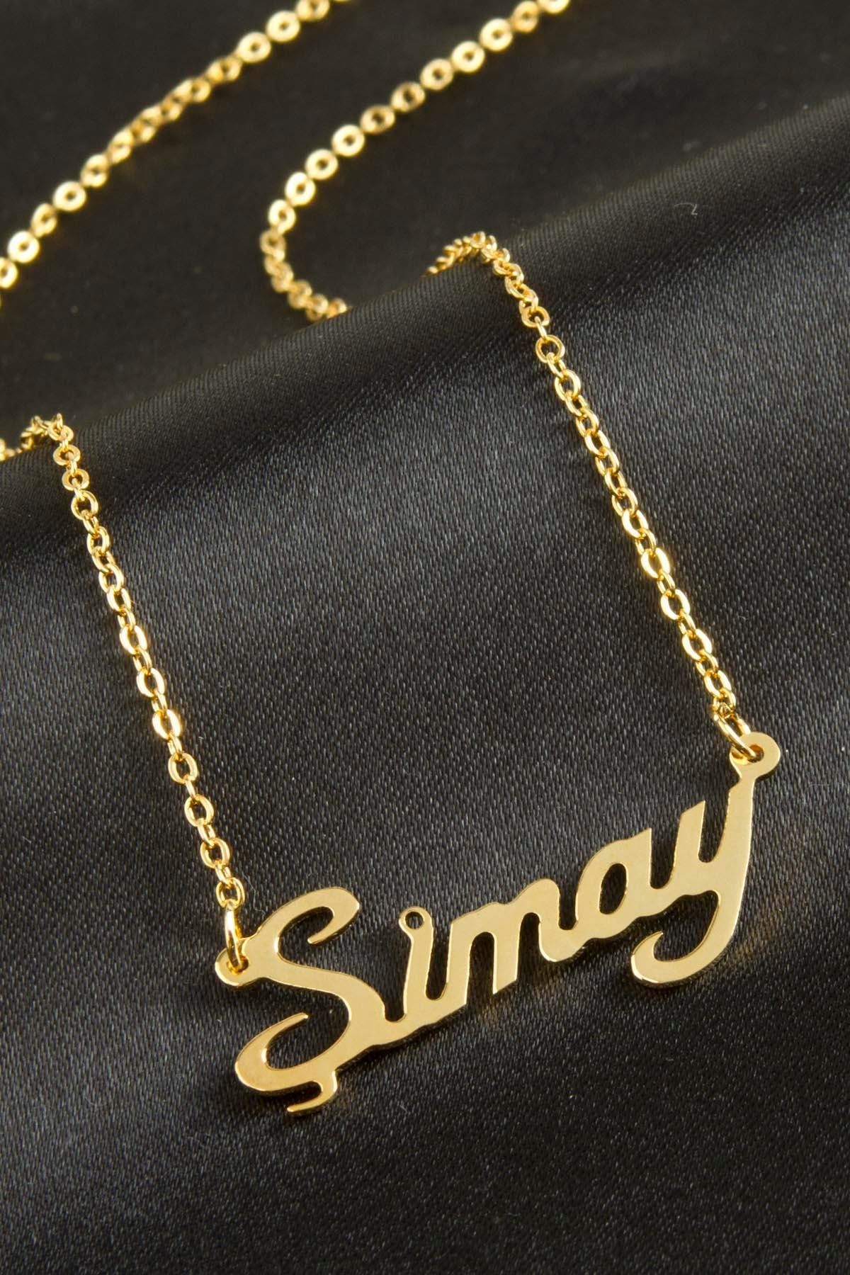 Şimay İsimli Kolye. İsimli kolye pirinç madeninden ve altın kaplamalıdır. Kişiye özel üretilmektedir.Yazdırmak istediğiniz ismi bize mesaj olarak iletmeniz gerekmektedir. Kullanıma bağlı olarak uzun süre kullanıma uygundur. Ürün malzemesi 1.sınıf kalitededir. Ürün ve zinciri sarı renktedir. Ürün zincir boyu 45 cm ve ürün üzerindeki isimler yaklaşık 3 cmdir. İsim boyları ürün ismine göre degişiklik göstermektedir.