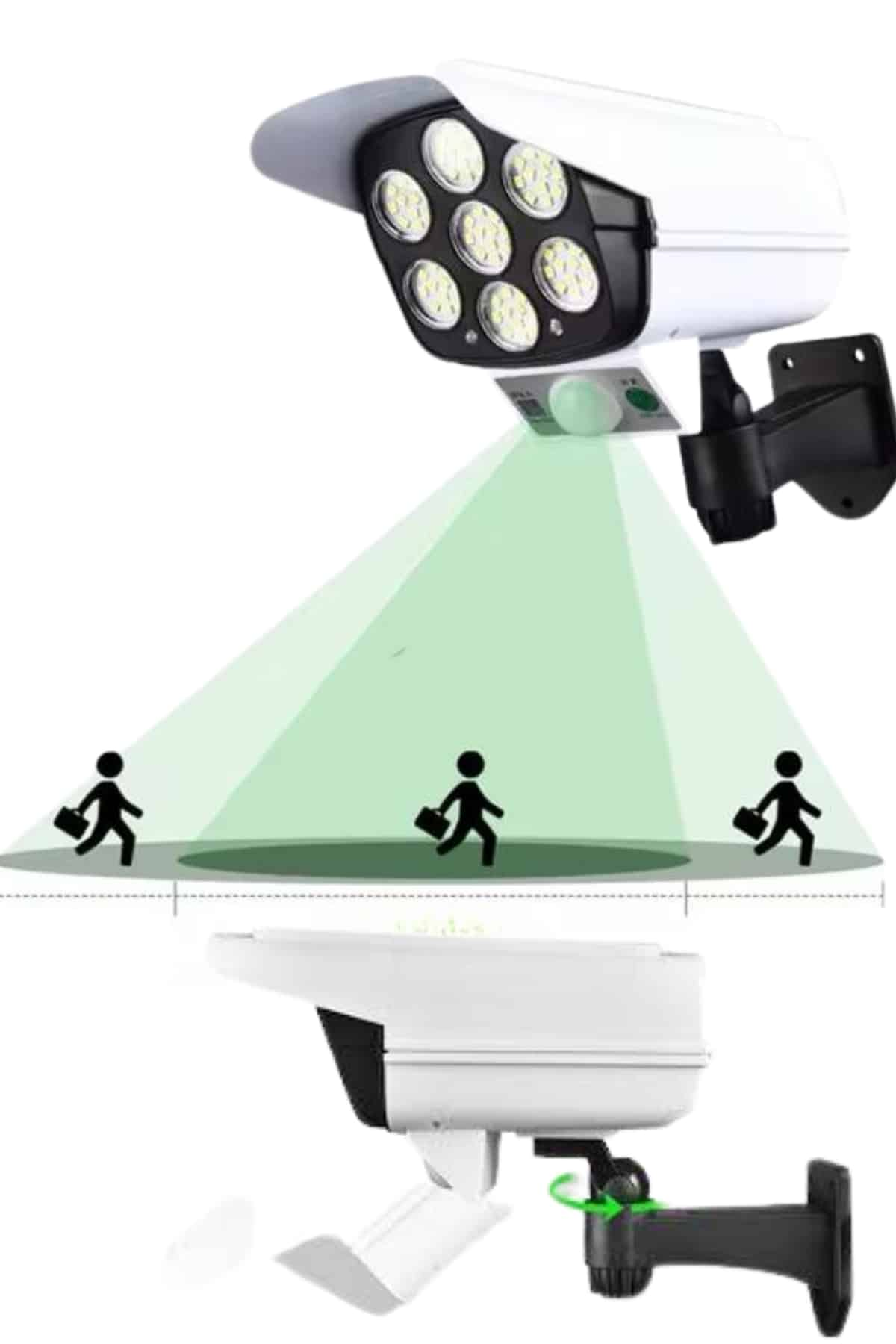 Bu güneş enerjili güvenlik ışığı, çevre dostu tasarımı ve pratik kullanımı ile hem güvenlik hem de dekoratif amaçlarla ideal bir çözümdür. Hem  kamera görünümü  hırsızları caydırma etkisi yaratır hem de bahçeniz için güçlü bir aydınlatma sunar. Dahili PIR hareket sensörü, 10 ila 20 feet mesafede hareketi algılayarak gece boyunca ışığın otomatik olarak yanmasını sağlar. Bu özellik, evinizin etrafındaki alanları güvenli hale getirir. Güneş paneli, güneş ışığını emerek şarj olur ve ışığın enerji ihtiyacını karşılar, böylece elektrik tüketimi ve çevreye olan etkisi minimuma iner. Pil kapasitesiyle de, düşük ışık modunda bile yaklaşık 40 saate kadar çalışma süresi sunar. Kurulumu oldukça basittir ve güneş paneli ve ışık kaynağının yönü 5 eksenli rotasyon sayesinde rahatça ayarlanabilir, böylece istediğiniz alanı verimli bir şekilde aydınlatabilirsiniz. IP66 su geçirmezlik standardına sahip olması, ürünün yağmur, kar gibi dış hava koşullarında bile dayanıklı olmasını sağlar. Bu ışık, güvenlik ihtiyacınızı karşılamakla kalmaz, aynı zamanda dış mekanlarınızı şık bir şekilde aydınlatarak, bahçeniz, verandanız, garajınız ya da yol kenarlarınıza estetik bir görünüm kazandırır.