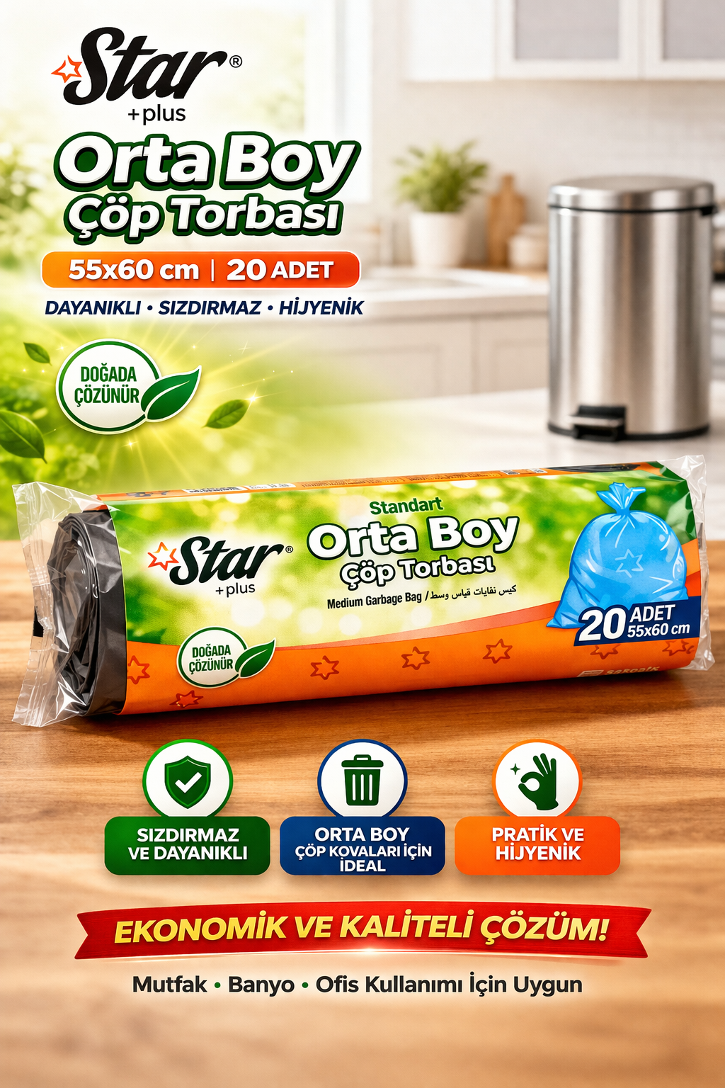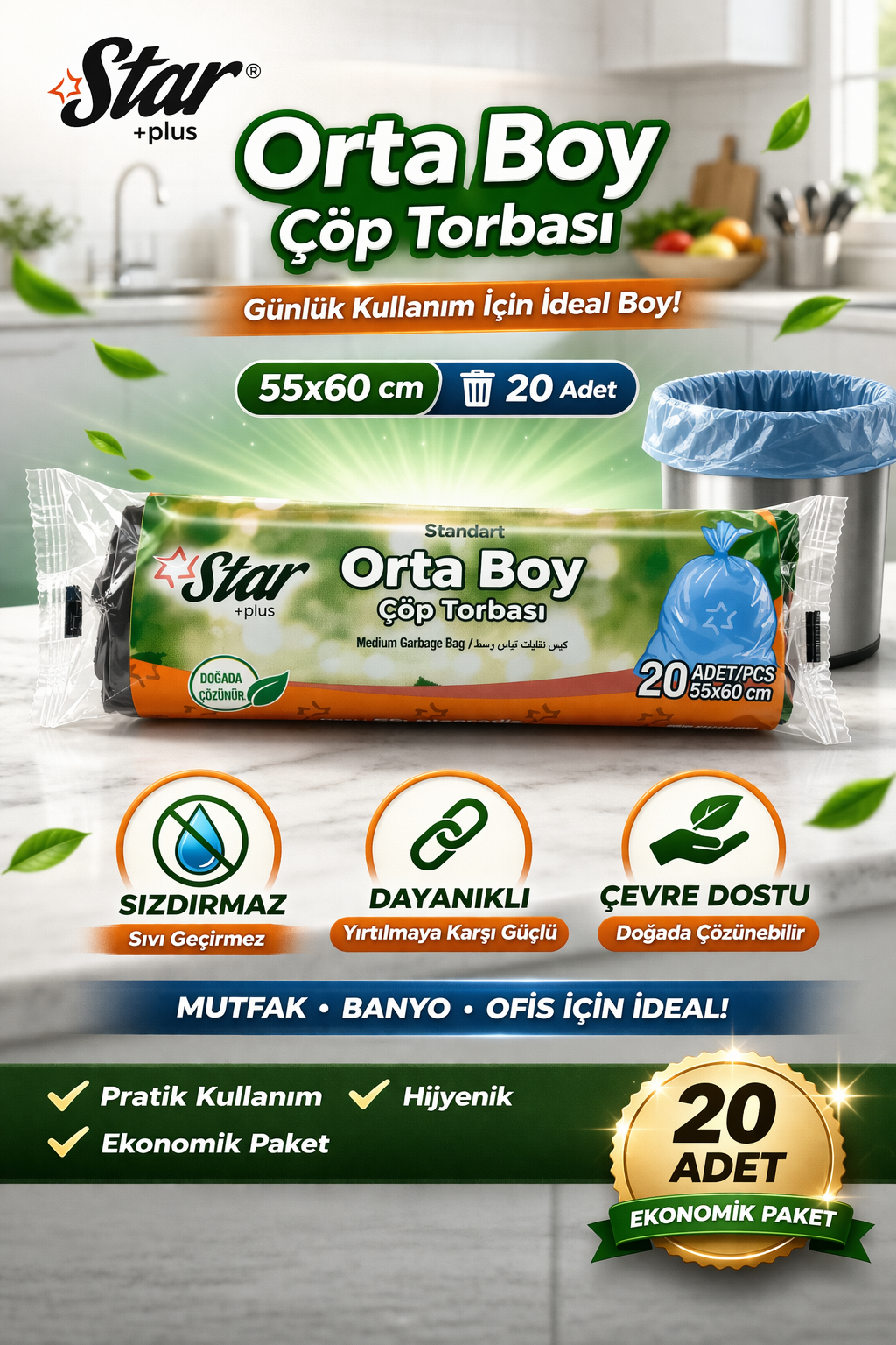 Star Plus Orta Boy Çöp Torbası, günlük kullanım için ideal ölçü ve dayanıklılığı bir arada sunar. 55x60 cm boyutu sayesinde mutfak, banyo ve ofis gibi alanlarda kullanılan orta boy çöp kovalarına tam uyum sağlar. 20 adetlik paket içeriği ile ekonomik ve uzun süreli kullanım avantajı sunar.