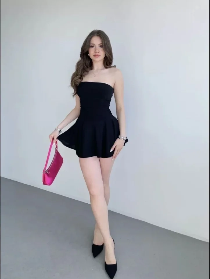Straplez Mini Etek Görünümlü Şortlu Elbise Büzgülü Şık Yazlık - Siyah