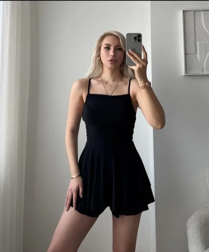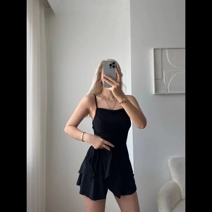 Straplez Mini Etek Görünümlü Şortlu Elbise Büzgülü Şık Yazlık - Siyah
