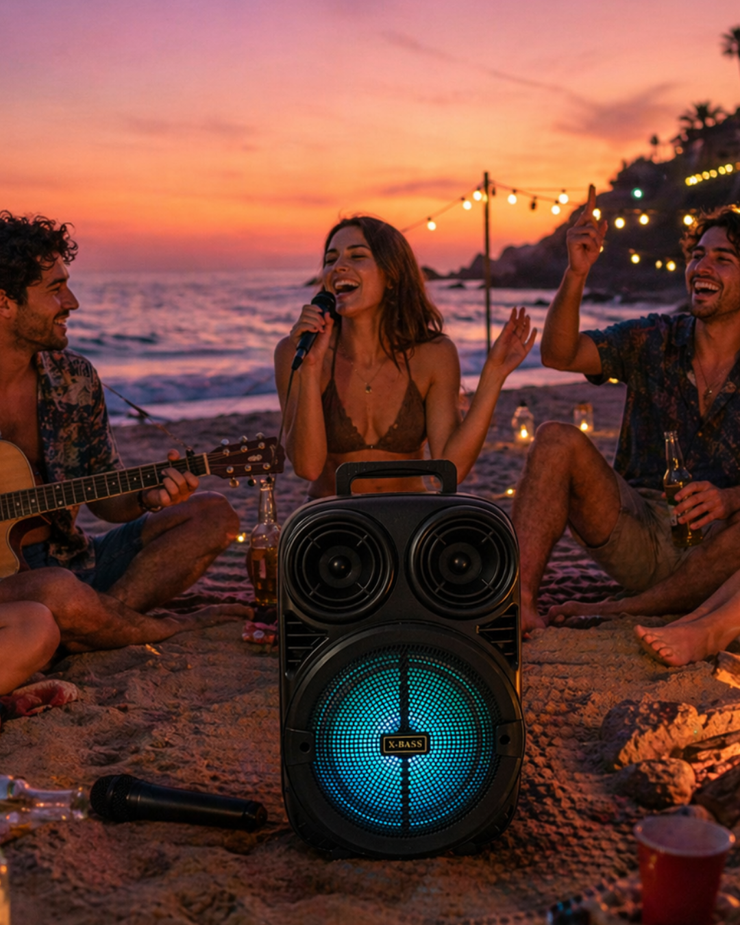 ETaşınabilir Bluetooth speaker modeli, güçlü ses çıkışı ve çok amaçlı kullanım özellikleriyle günlük hayatın vazgeçilmez ürünlerinden biri olmaya adaydır. 6.5 inç hoparlör sürücüsü sayesinde bulunduğu ortamı dolduran canlı ve net ses sunar. İster müzik dinleyin ister karaoke yapın, performansından memnun kalırsınız. Bluetooth bağlantısı sayesinde cihazınızı saniyeler içinde eşleştirir. Kablosuz kullanım kolaylığı ile özgürce hareket edebilirsiniz. AUX girişi sayesinde klasik bağlantı seçeneği de mevcuttur. Kutu içeriğinde bulunan mikrofon sayesinde karaoke deneyimi hemen başlar. Aile eğlenceleri, doğum günleri, piknikler ve arkadaş buluşmaları için idealdir. Mikrofon sesi net iletir ve kullanım kolaylığı sağlar. RGB aydınlatma sistemi hoparlöre şık görünüm kazandırır. Gece kullanımında çok daha etkileyici bir atmosfer yaratır. Parti ortamlarını canlandırır. USB ve TF kart desteği sayesinde internet gerekmeden müzik çalabilirsiniz. Kendi arşivinizi doğrudan hoparlörde dinlemek büyük avantaj sağlar. Şarjlı batarya sistemi taşınabilirliği artırır. Elektrik olmayan alanlarda bile rahat kullanım sunar. Taşıma kulpu sayesinde istediğiniz yere götürebilirsiniz. Şık tasarımı, güçlü sesi ve çoklu kullanım avantajıyla bu hoparlör her yaş grubuna hitap eder. Eğlenceyi her ortama taşımak isteyenler için doğru tercihtir.