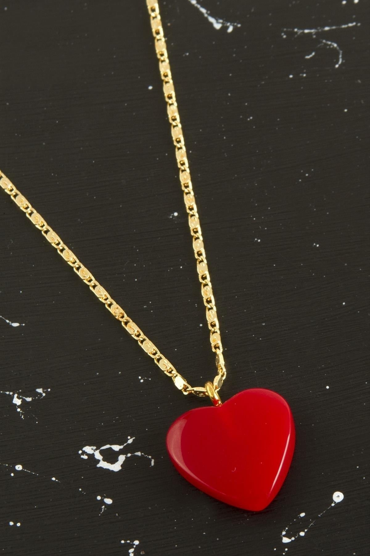 Kolye; Ürün zincir bölümü metal ve kalp bölümü plastiktir. Zincir uzunluğu 45 cm ve ucundaki kalp aparat boyu 2 cmdir.
