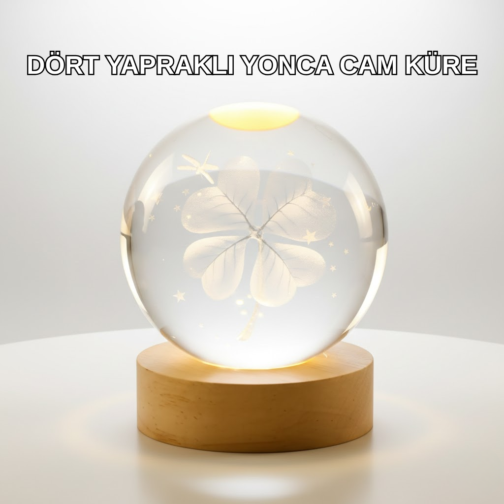 Yonca Figürlü Cam Küre USB Işıklı Ahşap Tabanlı Dekoratif Masa Lambası