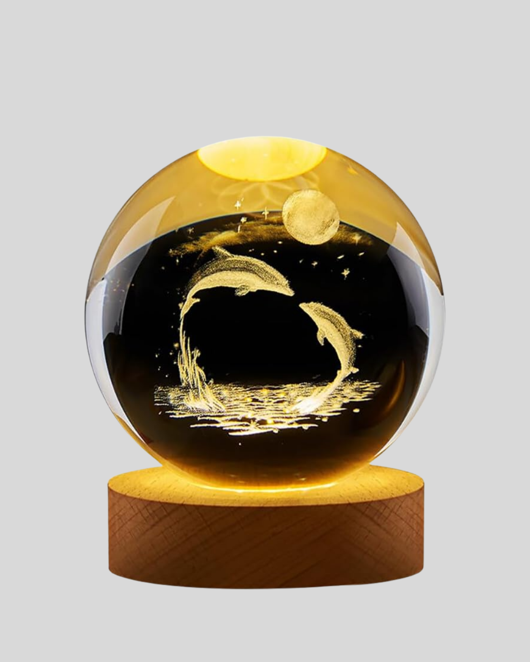 Kristal yüzeyin parlaklığı ve içindeki lazer oyma yunus deseni üstün işçilikle hazırlanmıştır. Ahşap taban, doğal dokusuyla ürünü hem dayanıklı hem de estetik hale getirir. Işık açıkken büyüleyici, ışık kapalıyken bile zarif bir dekoratif obje olarak kullanılabilir. Uzun ömürlü LED ışığıyla kaliteli bir kullanım deneyimi sunar.