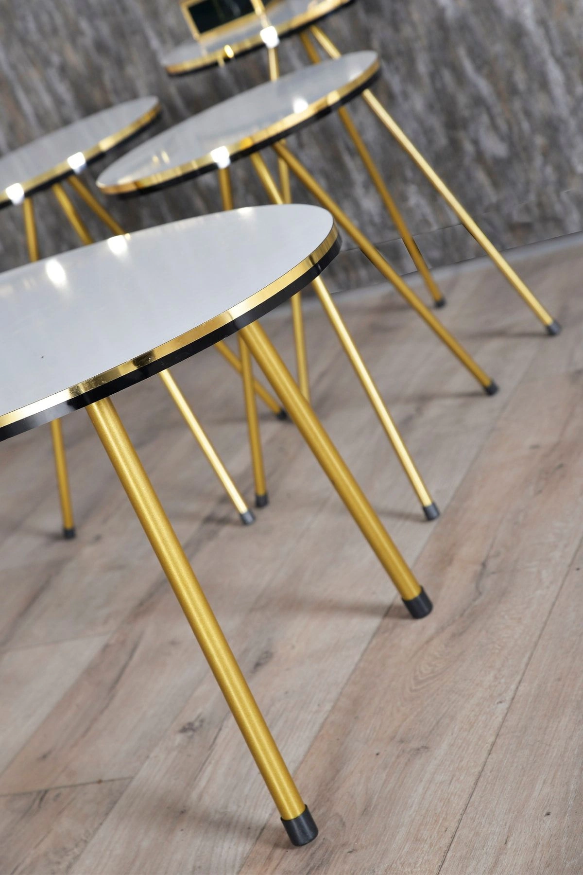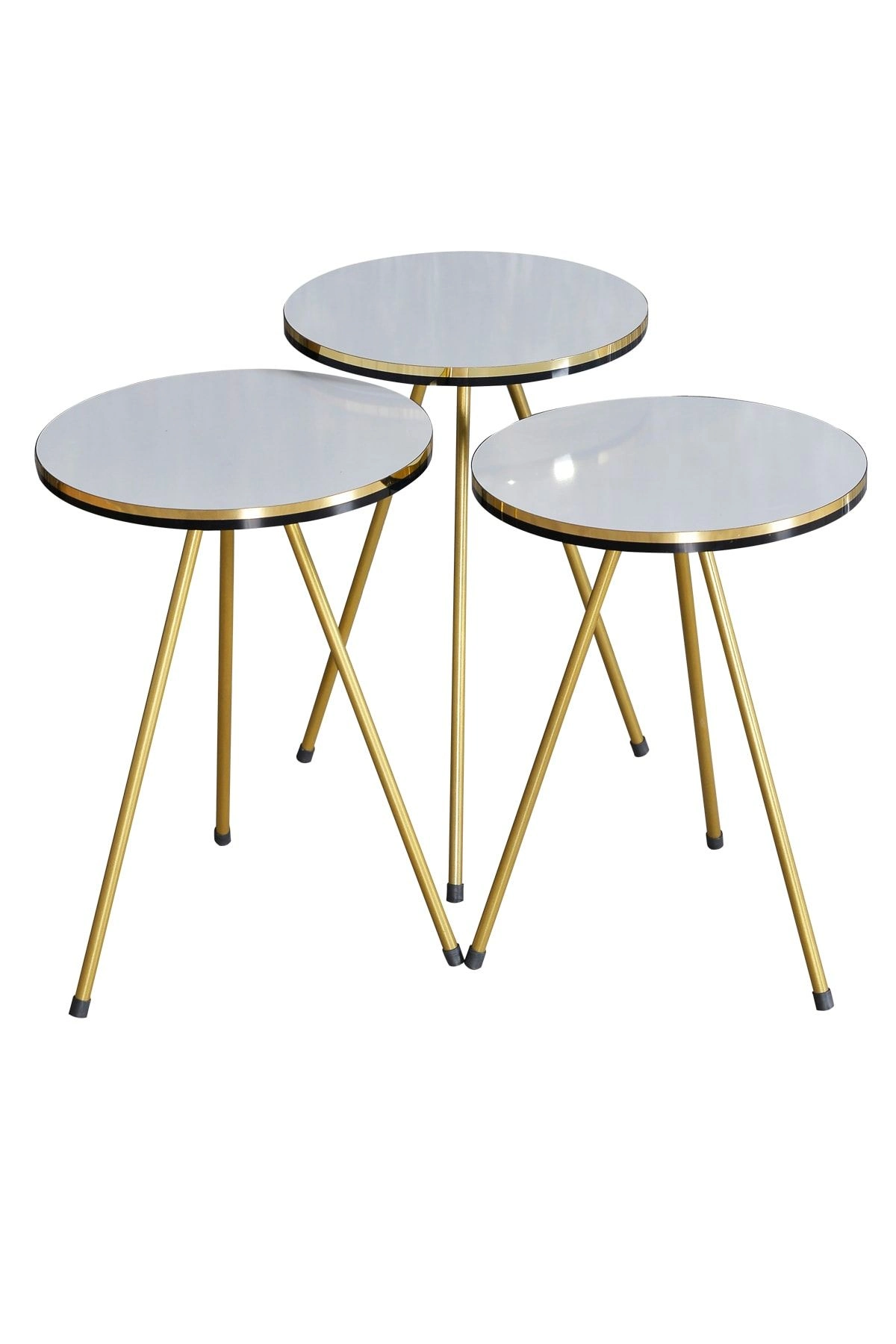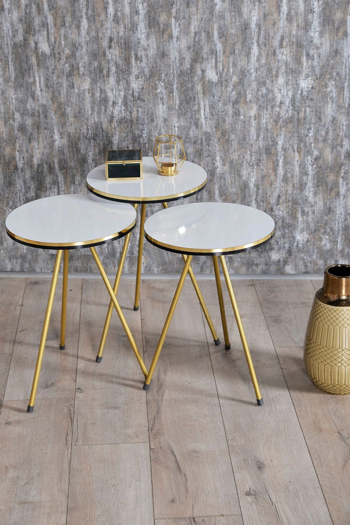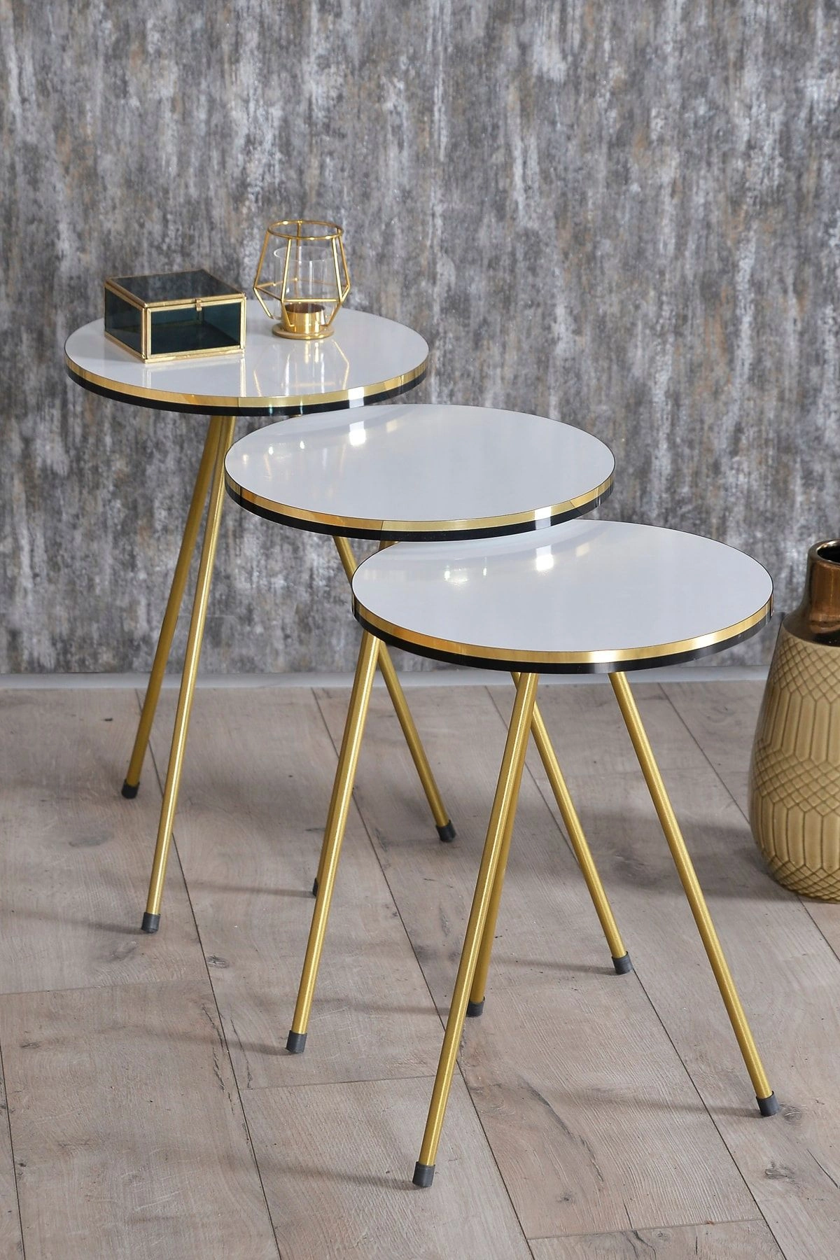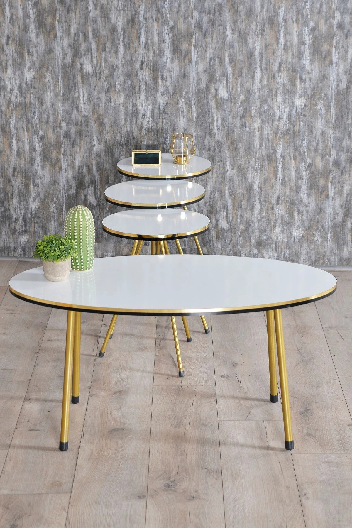Zigon Sehpa ve Orta Sehpa Elips Set Çift Gold Beyaz Metal