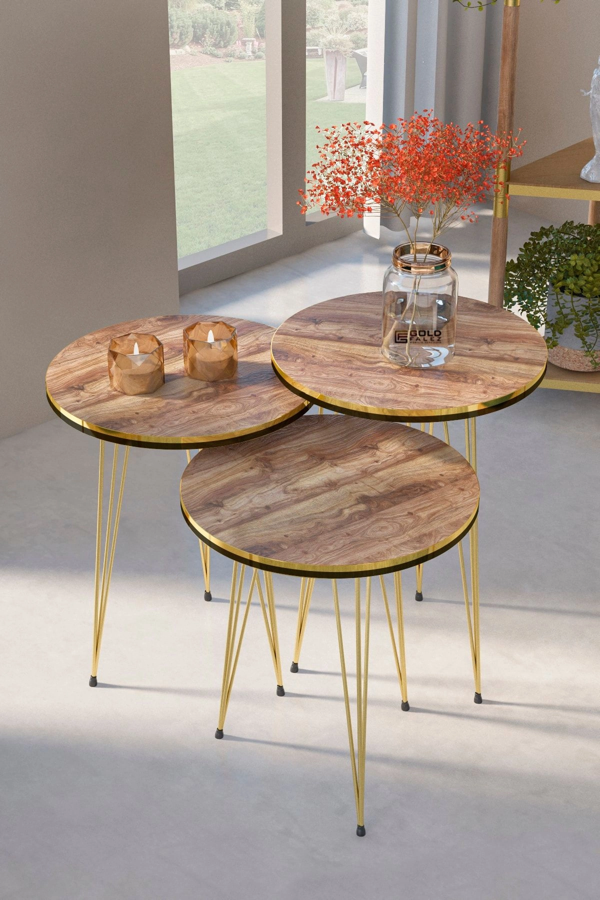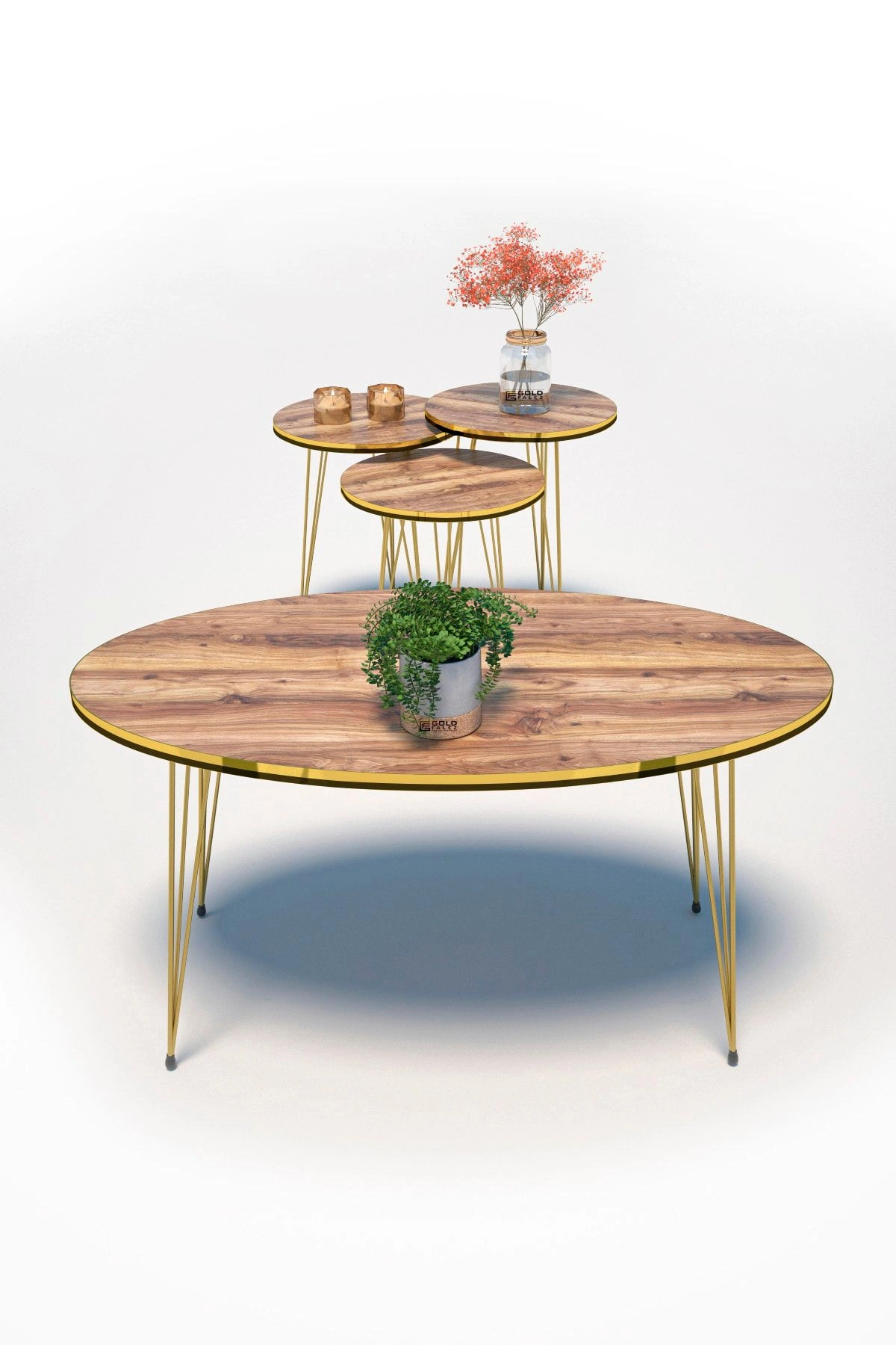 Zigon Sehpa Ve Orta Sehpa Elips Set Çift Gold Ceviz Tel